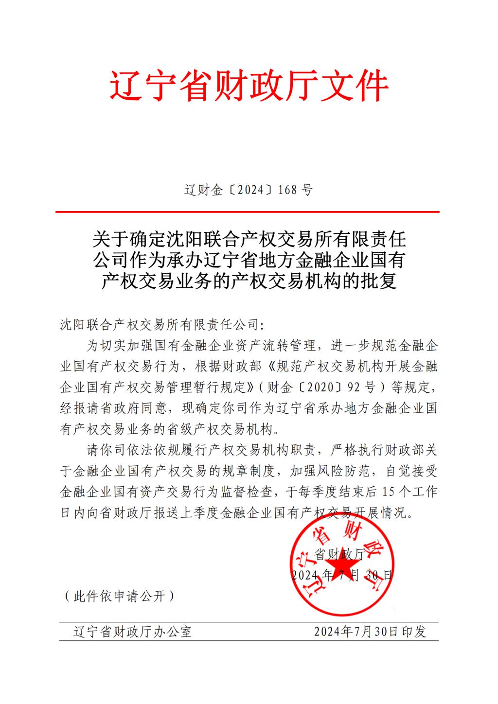2024年7月30日,遼寧省財(cái)政廳印發(fā)《關(guān)于確定沈陽聯(lián)合產(chǎn)權(quán)交易所有限責(zé)任公司作為承辦遼寧省地方金融企業(yè)國有產(chǎn)權(quán)交易業(yè)務(wù)的產(chǎn)權(quán)交易機(jī)構(gòu)的批復(fù)》(遼財(cái)金〔2024〕168 號(hào)),這是繼2009年沈陽聯(lián)合產(chǎn)權(quán)交易所(以下簡(jiǎn)稱“沈交所”)首次獲批后,再次通過遼寧省地方金融企業(yè)國有產(chǎn)權(quán)交易業(yè)務(wù)資質(zhì)審核。