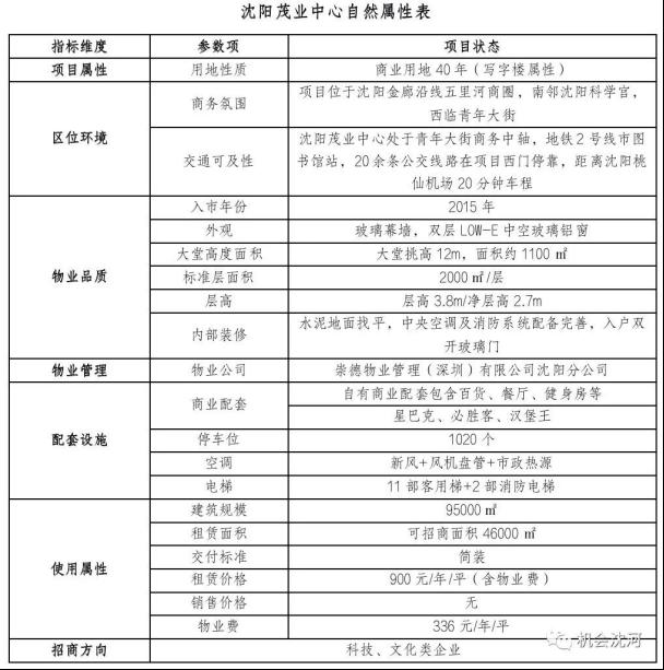 項目簡介:沈陽茂業(yè)中心是集甲級寫字樓、購物中心(茂業(yè)百貨)、高檔公寓、豪華住宅的綜合性項目,大廈外立面采用遠(yuǎn)大玻璃幕,保溫隔音,節(jié)源美觀,建筑面積10萬平方米,可招商面積4.6萬平方米,租賃價格900元/年/平(含物業(yè)費(fèi))。
