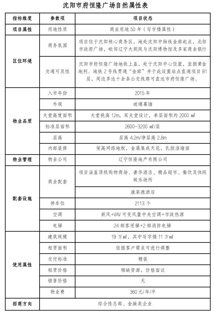 項(xiàng)目簡(jiǎn)介:沈陽(yáng)市府恒隆廣場(chǎng)辦公樓位于沈河區(qū)青年大街1號(hào),2015年投入運(yùn)營(yíng),屬5A級(jí)辦公樓,項(xiàng)目總高達(dá)350.6米,地上88層,地下4層,辦公樓租賃面積約11萬(wàn)平,產(chǎn)權(quán)單位及物業(yè)單位均為遼寧恒隆地產(chǎn)有限公司。目前高標(biāo)準(zhǔn)樓宇商業(yè)綜合體、寫(xiě)字樓商業(yè)部分已經(jīng)完工,三期待建住宅、酒店、商場(chǎng)。已引進(jìn)三井住友銀行(中國(guó))有限公司沈陽(yáng)分行、北京大成(沈陽(yáng))律師事務(wù)所、西門子(中國(guó))有限公司沈陽(yáng)分公司等諸多知名企業(yè)。