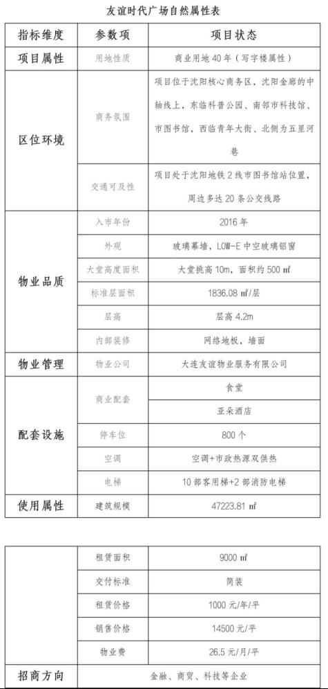 配套設(shè)施:駐友誼時代,享別樣新風(fēng)。商業(yè)配套完善,科普公園一墻之隔,亞朵、萬豪、凱賓斯基等中高端酒店依次排布,佳兆業(yè)、一方廣場、K11、萬象城商業(yè)資源應(yīng)有盡有,北部戰(zhàn)區(qū)總醫(yī)院及盛京醫(yī)院均距離項目僅1公里。同時,項目按甲級5A寫字間標準設(shè)計建設(shè),取得了美國LEED金獎?wù)J證、綠色建筑二星認證,擁有近600平米大堂,挑高12米,擁有12部進口高速客梯,4部消防梯,層高4.8米,公共走廊寬2米,無梁無柱設(shè)計,空間可自由分割、組合,采用進口高檔雙管制風(fēng)機盤管中央空調(diào)配置,新風(fēng)量可達30立方米每人每小時,并且有效過濾PM2.5。