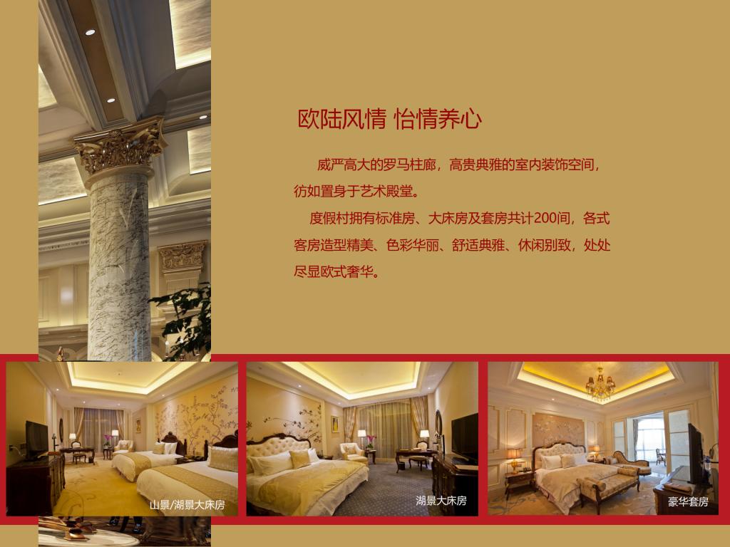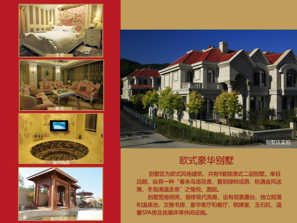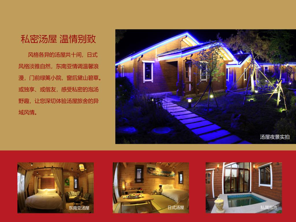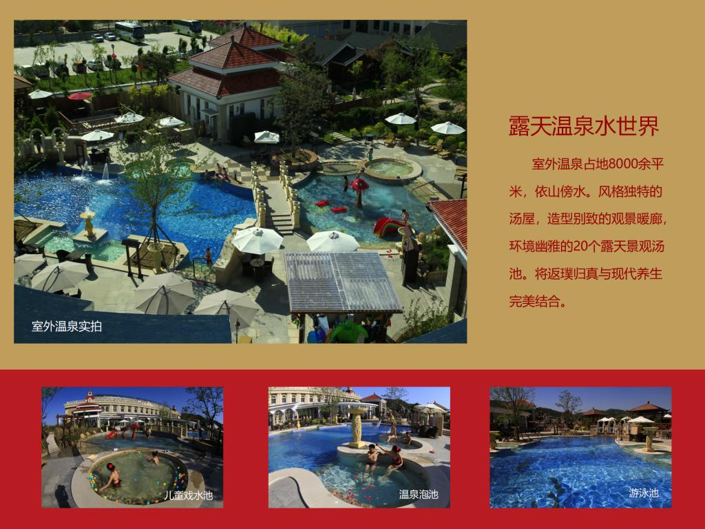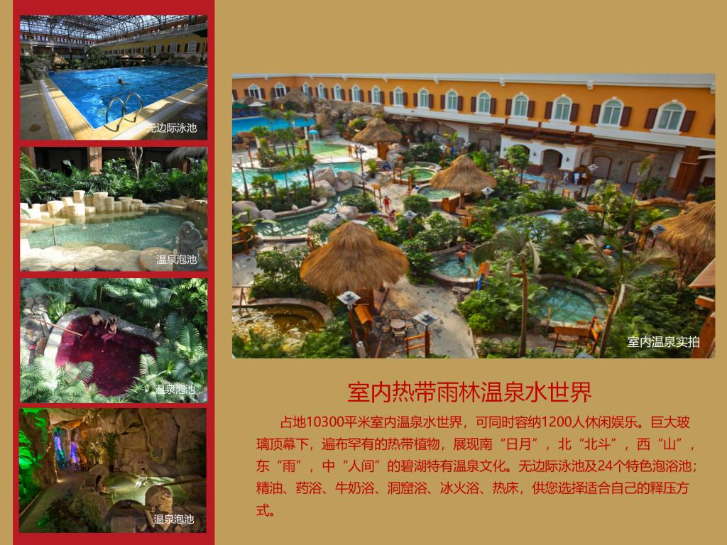 碧湖溫泉度假村項目總投資86,646.04萬元,占地234.12畝,總建筑面積50,151.62㎡,其中:宴會中心3,472.25㎡,設(shè)有一個宴會大廳、七個會議室,可容納300人的會議及就餐;酒店27,038.14㎡,設(shè)有客房200間,餐飲包房17間,多功能餐廳一個能容納150人同時就餐,員工食堂一個可同時容納200人就餐;兩棟貴賓樓4,300㎡,設(shè)有客房9套;溫泉中心(室內(nèi)溫泉)11,866.51㎡,設(shè)有各種泡池25個及一個9米×20米的游泳池,日可接納1,300人/次洗??;室外溫泉占地近9,000㎡,設(shè)有全封閉式木制結(jié)構(gòu)湯屋10間(每棟面積約50㎡)、各類泡池18個、室外泳池506㎡,日可接納1500人/次;員工宿舍3,474.72㎡。