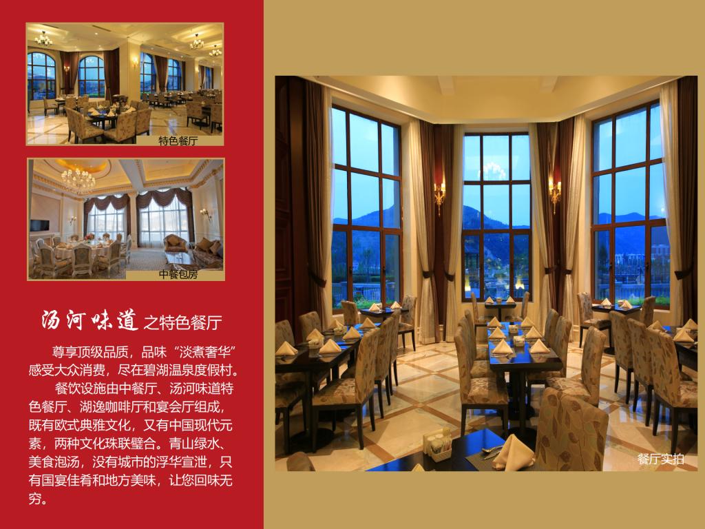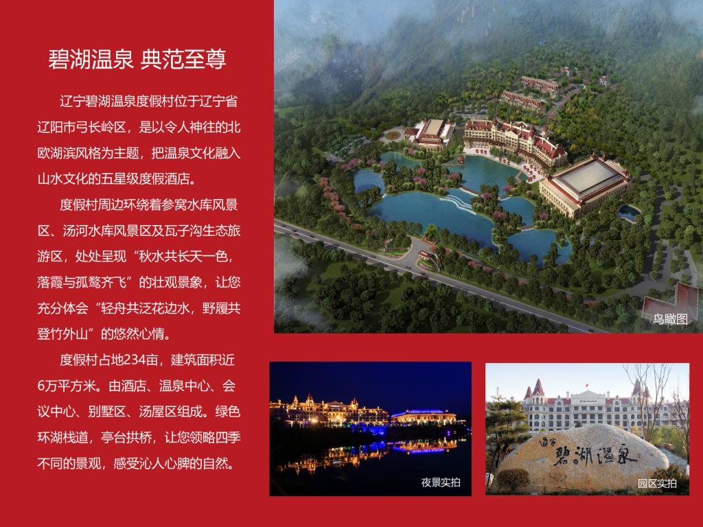 碧湖溫泉度假村以北歐湖濱風(fēng)格為主題,把溫泉文化融入山水文化的五星級度假酒店,綠色環(huán)湖棧道,亭臺拱橋,集觀光賞景、養(yǎng)生保健、餐飲娛樂、休閑度假及商務(wù)會議為一體。曾獲得“遼寧省十佳飯店”、“遼寧省旅游溫泉品質(zhì)特級認(rèn)證”、遼寧省冰雪溫泉協(xié)會評定的“全國首批十佳五星級溫泉企業(yè)”等稱號,2014年還被評定為“國家機(jī)關(guān)老干部健康療養(yǎng)示范基地”。