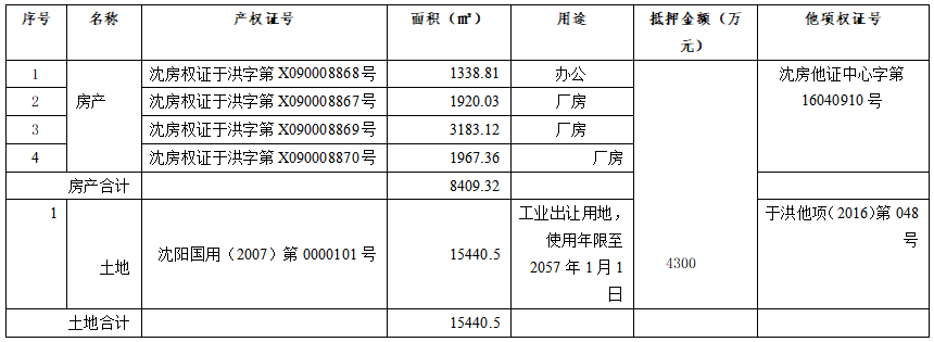 3、沈陽萬路華瑞汽車用品廠名下位于沈陽市于洪區(qū)洪匯路183-1號(hào)至183-4號(hào)面積合計(jì)8409.32平方米的4處廠房及位于沈陽市于洪區(qū)于洪街道西和平村面積15440.51平方米的一宗工業(yè)出讓用地,具體情況如下表: