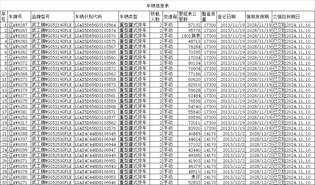 沈陽城市公用集團物流有限公司于2013年11月和12月分兩批購入30臺煤粉罐車,其中20臺裝備質(zhì)量17300千克,10臺裝備質(zhì)量14170千克。該30臺罐車主要用于運輸煤粉,每年運行期5個月,自2020年起停運?,F(xiàn)進行招商推介,如有意向購買,詳情咨詢聯(lián)系人:姚雙德,聯(lián)系電話:18640336866。