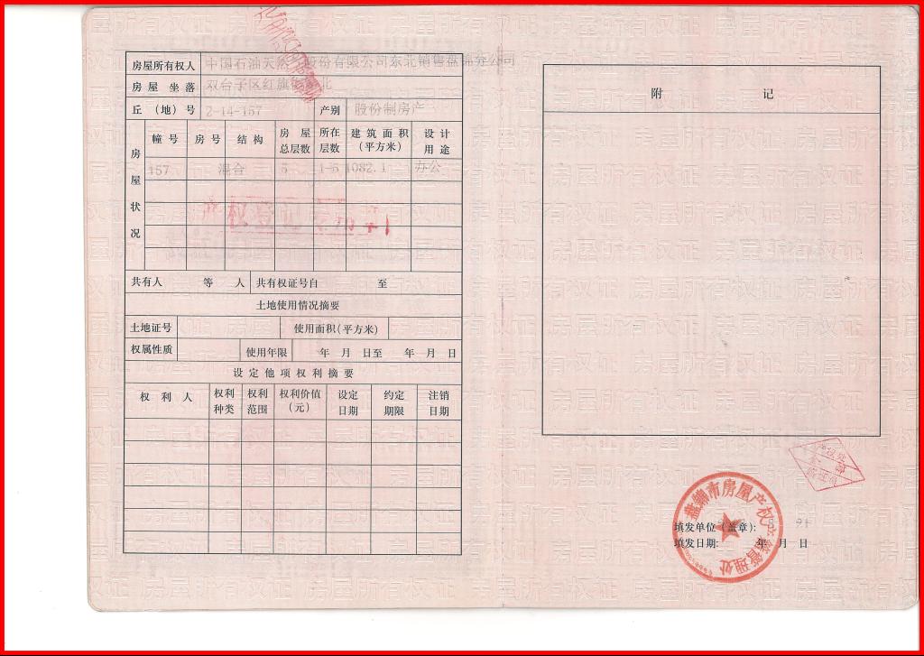 不動(dòng)產(chǎn)權(quán)證(房產(chǎn)證)編號(hào)“盤房權(quán)證字第2006156號(hào)”,證載權(quán)利人為“中國(guó)石油天然氣股份有限公司東北銷售盤錦分公司”,建筑面積1080.10㎡,混合結(jié)構(gòu),共5層,房屋設(shè)計(jì)用途為“辦公”,原房產(chǎn)用途為“辦公樓”。土地用途為“其他商服用地”,土地性質(zhì)為“授權(quán)經(jīng)營(yíng)”,土地使用期限截止時(shí)間為2039年6月29日。