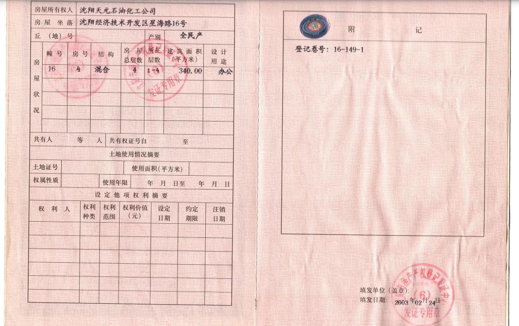 房屋產(chǎn)權證編號為沈房權證經(jīng)濟技術開發(fā)區(qū)字第002018號,證載權利人為沈陽天元石油化工公司,房屋建筑面積340㎡,混合結構,房產(chǎn)共4層,房屋設計用途為辦公。該房產(chǎn)所在土地為共用土地,且已過使用年限,2018年天元公司改制由沈陽天元石油化工公司變更為沈陽天元石油化工有限責任公司,因土地無登記信息,房產(chǎn)與土地信息無法歸集,不能換發(fā)不動產(chǎn)登記證并完成更名。因此目前僅有房屋產(chǎn)權證,證載權利人為沈陽天元石油化工公司。