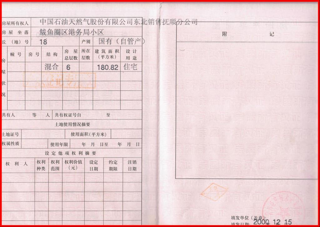 (二)住房房權(quán)證編號為鲅房權(quán)證字第0004460號,發(fā)證機(jī)關(guān)為營口市房產(chǎn)管理局。房屋所有權(quán)人為中國石油天然氣股份有限公司東北銷售撫順分公司,建筑面積180.82㎡,產(chǎn)別:國有(自管產(chǎn)),混合結(jié)構(gòu),房屋總層數(shù)為6層,所在樓層302室和501室,房屋設(shè)計用途為住宅,兩套房產(chǎn)使用一張房照。土地性質(zhì)未知,發(fā)證時間為2000年12月15日。