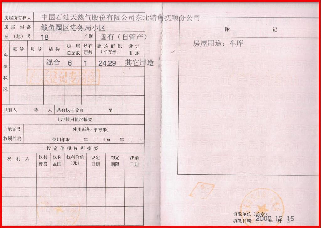 (一)車庫房權(quán)證編號為鲅房權(quán)證字第0004459號,發(fā)證機(jī)關(guān)為營口市房產(chǎn)管理局。房屋所有權(quán)人為中國石油天然氣股份有限公司東北銷售撫順分公司,建筑面積24.29㎡,產(chǎn)別:國有(自管產(chǎn)),混合結(jié)構(gòu),房產(chǎn)所在樓層為1/6層,房屋設(shè)計用途為其他用途。房屋用途為車庫,土地性質(zhì)未知,發(fā)證時間為2000年12月15日。