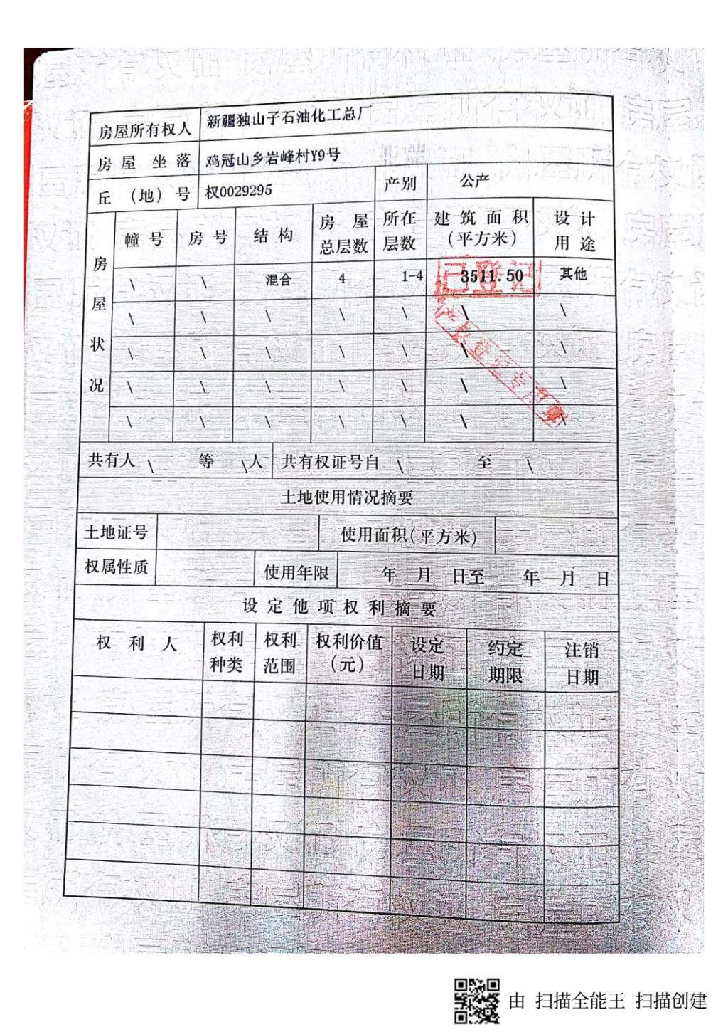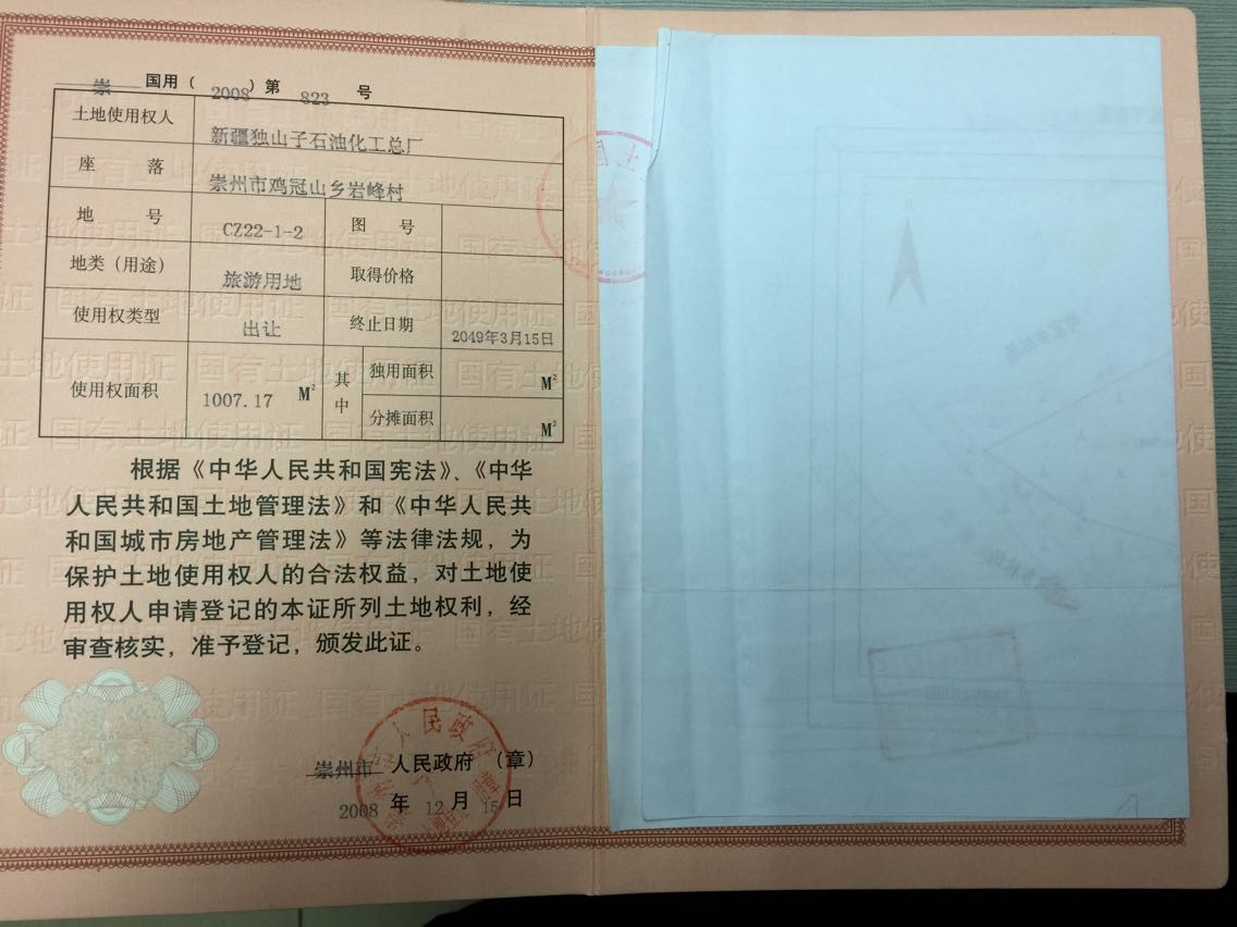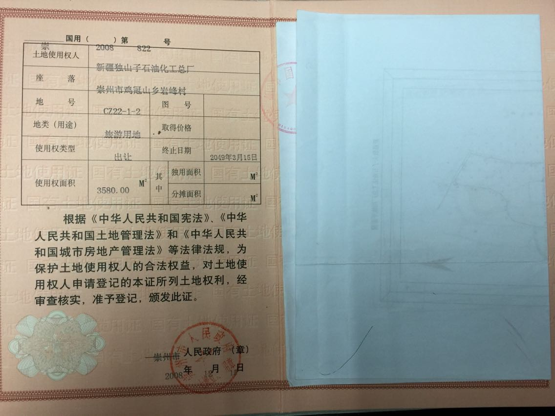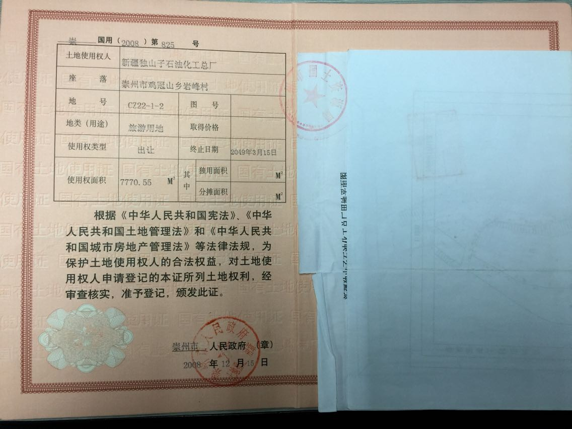 房產(chǎn)證編號“崇房權(quán)證監(jiān)證字第0041251號、崇房權(quán)證監(jiān)證字第0041252號”,證載權(quán)利人為“新疆獨山子石油化工總廠”,建筑面積4618.88㎡,混合結(jié)構(gòu),其中主樓為一座四層綜合樓,面積為3511.50平方米,內(nèi)設(shè)57個標(biāo)準(zhǔn)間,3個45平方米的多功能大廳,另有一座配套綜合用房,面積為1107.38平方米,內(nèi)設(shè)26間房,房產(chǎn)證載用途為“其他”。土地證編號“崇國用(2008)字第822號、崇國用(2008)字第823號、崇國用(2008)字第825號”土地用途為“旅游用地”,土地性質(zhì)為“出讓”,土地面積12357.72㎡,土地使用期限截止時間為2049年3月15日。