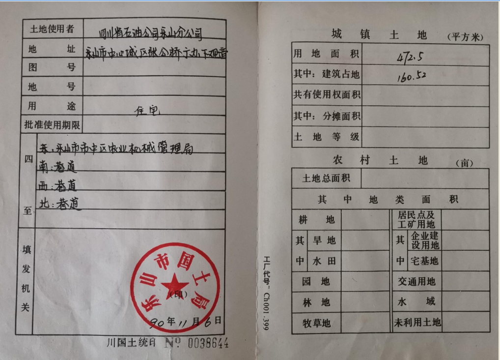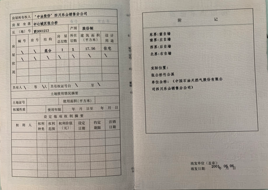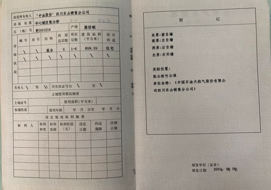 土地證編號“樂城國用(90)字003942”,證載權(quán)利人為“四川省石油公司樂山分公司”,用地面積472.5㎡;房產(chǎn)證編號“樂山市房權(quán)證企業(yè)字第0001214號”,證載權(quán)利人為“中油股份四川樂山銷售分公司”建筑面積858.59㎡,混合結(jié)構(gòu),共6層,房屋設(shè)計用途為“住宅”,原房產(chǎn)用途為“住宅樓”;房產(chǎn)證編號“樂山市房權(quán)證企業(yè)字第0001213號”,證載權(quán)利人為“中油股份四川樂山銷售分公司”建筑面積17.56㎡,混合結(jié)構(gòu),房屋設(shè)計用途為“住宅”,原房產(chǎn)用途為“住宅樓”。