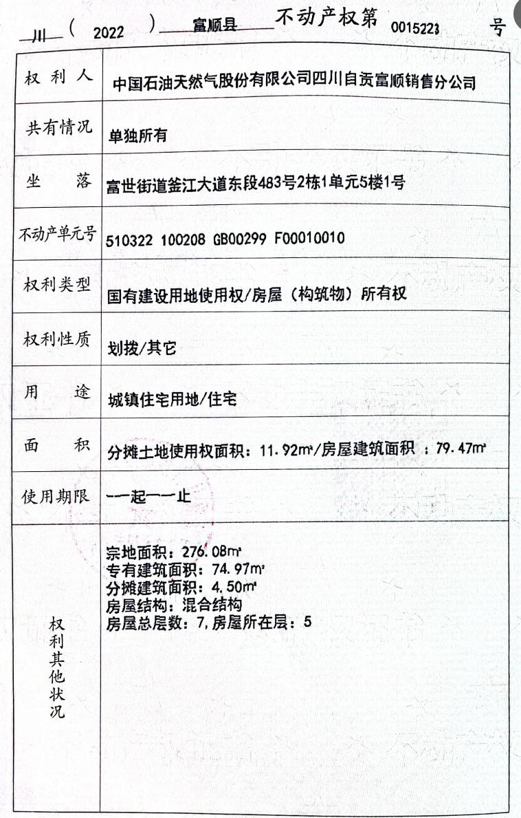 不動產(chǎn)權(quán)證編號為“川(2022)富順縣不動產(chǎn)權(quán)第0015221號”,證載權(quán)利人為“中國石油天然氣股份有限公司四川自貢富順銷售分公司”,建筑面積為79.47㎡,混合結(jié)構(gòu),所在層5層,原房產(chǎn)用途為“宿舍”,土地用途為“城鎮(zhèn)住宅用地”,土地性質(zhì)為“劃撥”,土地面積11.92㎡,無使用截止時間。