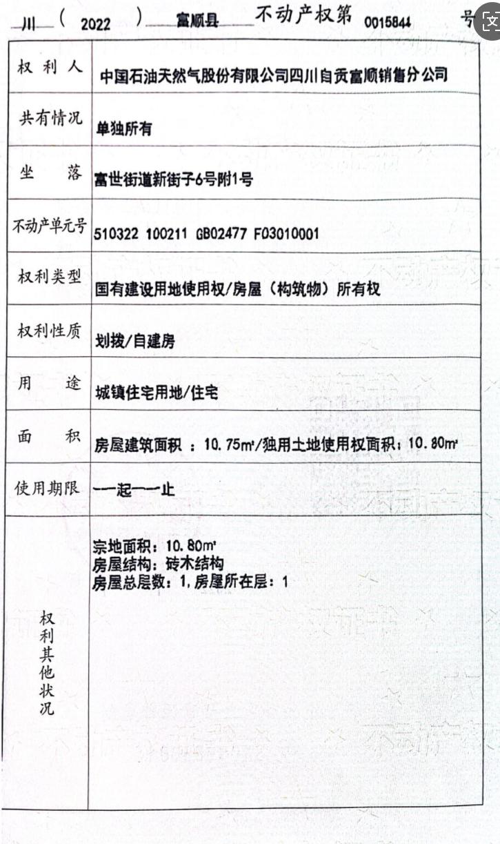 不動產(chǎn)權(quán)證編號為“川(2022)富順縣不動產(chǎn)權(quán)證第0015841號”,證載權(quán)利人為“中國石油天然氣股份有限公司四川自貢富順銷售分公司”,建筑面積為10.75㎡,磚木結(jié)構(gòu),所在層1層,原房產(chǎn)用途為“宿舍”,土地用途為“城鎮(zhèn)住宅用地”,土地性質(zhì)為“劃撥”,土地面積10.8㎡,無使用截止時間。