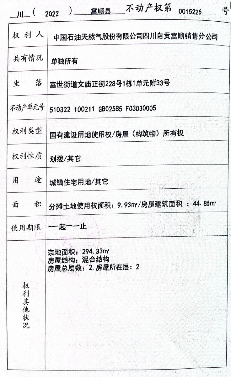 不動產(chǎn)權證編號為“川(2022)富順縣不動產(chǎn)權第0015225號”,證載權利人為“中國石油天然氣股份有限公司四川自貢富順銷售分公司”,建筑面積為44.85㎡,混合結構,層數(shù)為2層,原房產(chǎn)用途為“宿舍”,土地用途為“城鎮(zhèn)住宅用地”,土地性質(zhì)為“劃撥”,土地面積9.93㎡,無使用截止時間。
