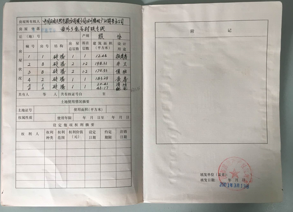 房產(chǎn)證編號(hào)“房權(quán)證廣權(quán)字第9786-1號(hào)、房權(quán)證廣權(quán)字第9789-1號(hào)”,證載權(quán)利人為“中國(guó)石油天然氣股份有限公司四川德陽(yáng)廣漢銷售分公司”,建筑面積120.63/12.44/198.32/170.53/183.29/20.41/46.17㎡,房屋設(shè)計(jì)用途為“消防泵房/扳道房/井衛(wèi)/值班/泵房/消防/配電”。