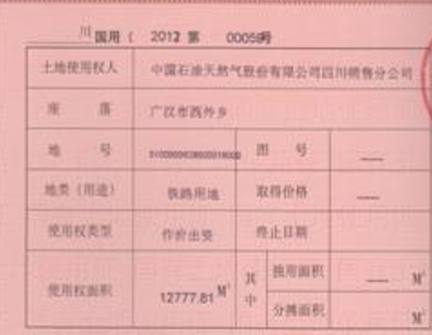 土地證編號(hào)“川國(guó)用(2012)第00056號(hào)”,證載權(quán)利人為“中國(guó)石油天然氣股份有限公司四川德陽(yáng)銷售分公司”,土地用途為“鐵路用地”,土地性質(zhì)為“作價(jià)出資”,土地面積12777.81㎡,土地未限制使用期限。