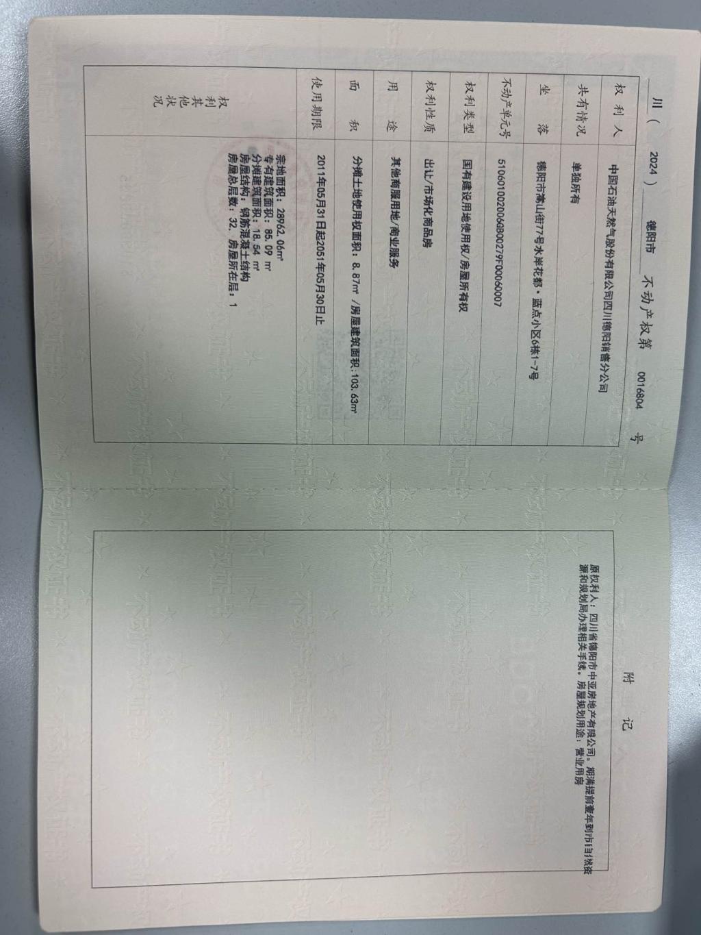 不動產(chǎn)權(quán)證編號“川(2024)德陽市不動產(chǎn)權(quán)第0016804”,證載權(quán)利人為“中國石油天然氣股份有限公司四川德陽銷售分公司”,房產(chǎn)面積103.63㎡,房屋設(shè)計用途為“商業(yè)服務(wù)”。土地用途為“其他商服用地”,土地性質(zhì)為“出讓”,土地面積8.87㎡,土地使用期限截止時間為2051年5月30日。