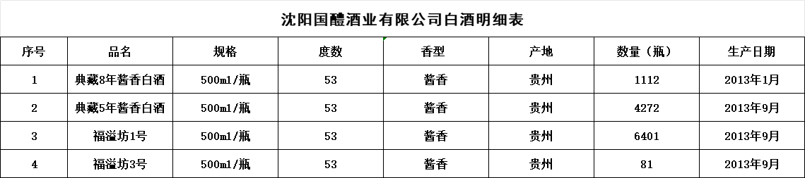 沈陽國醴酒業(yè)有限公司于2013年從貴州購入一批白酒,分別是典藏8年醬香白酒、典藏5年醬香白酒、福溢坊1號白酒、福溢坊3號白酒等。目前典藏8年醬香白酒1112瓶、典藏5年醬香白酒4272瓶、福溢坊1號白酒6401瓶、福溢坊3號白酒81瓶。我公司擬將上述4款白酒進行招商推介,如有意向方,請聯(lián)系:李俊華,聯(lián)系電話:13904027821。