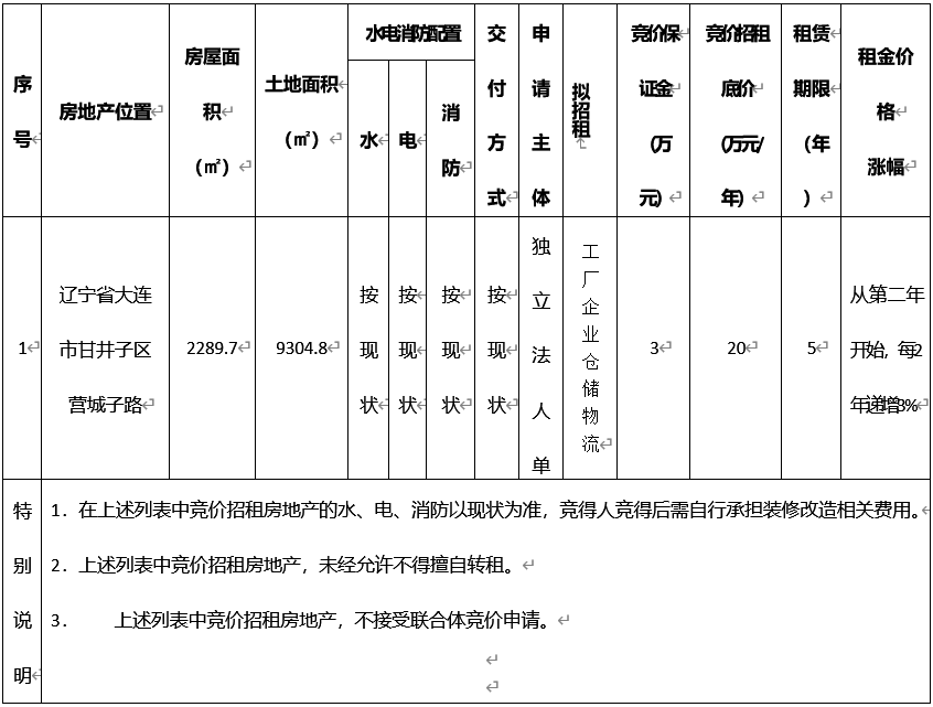 1、競價人自行聯(lián)系踏勘(附件《租賃項目計劃招租表》中有聯(lián)系人及電話),一旦報價則視為競價人已經(jīng)充分了解租賃標(biāo)的數(shù)量、質(zhì)量、規(guī)劃、構(gòu)成、土地性質(zhì)等全部情況,自動承諾對面積、現(xiàn)狀無異議,實際面積與公告面積出入不影響最終成交價,在獲得成交資格后對招租文件內(nèi)容或招租文件中合同條款提出異議或更改,將取消其成交資格,競價保證金不予退還。