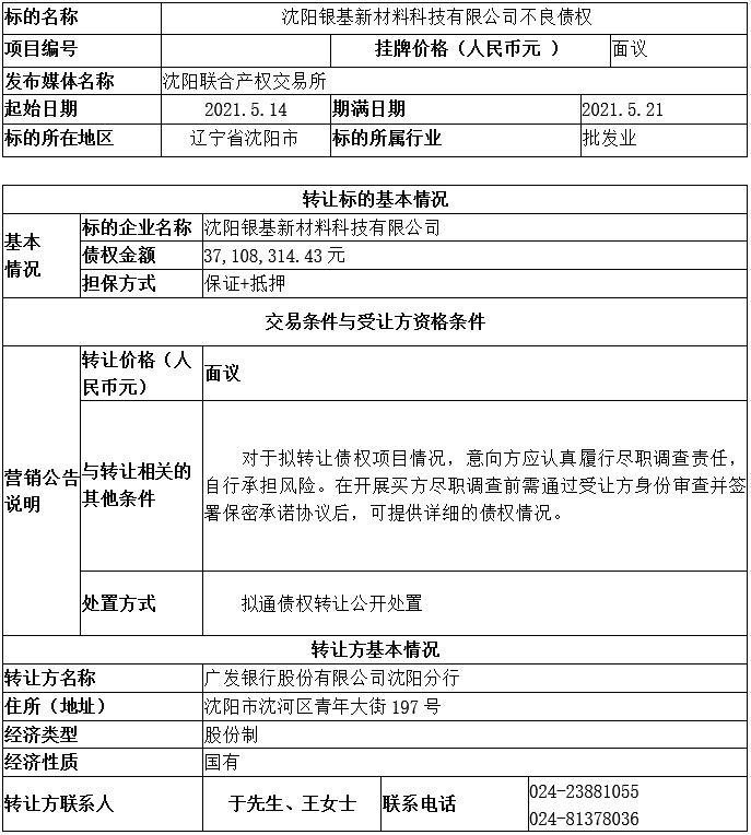 廣發(fā)銀行股份有限公司沈陽分行對其持有的沈陽銀基新材料科技有限公司不良債權(quán) 公開轉(zhuǎn)讓,廣泛征集意向受讓方,特此公告如下: