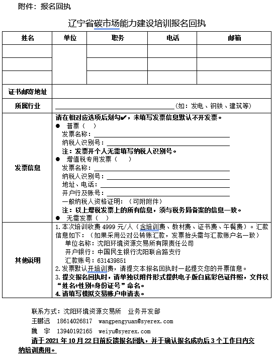 上海環(huán)境能源交易所作為全國碳市場的交易機(jī)構(gòu),與沈陽環(huán)境資源交易所共建“全國碳市場能力建設(shè)(上海)中心遼寧培訓(xùn)基地”,旨為在遼寧省培養(yǎng)更多了解碳市場相關(guān)政策、掌握碳排放核算技術(shù)和碳市場交易規(guī)則的專業(yè)人才,規(guī)范行業(yè)管理標(biāo)準(zhǔn)。遼寧省碳市場能力建設(shè)首期培訓(xùn)于5月份成功舉辦,全國碳市場能力建設(shè)(上海)中心遼寧培訓(xùn)基地計(jì)劃于11月初開展第二期遼寧省碳市場能力建設(shè)暨上海環(huán)境能源交易所碳排放交易員資格認(rèn)證培訓(xùn)相關(guān)工作。現(xiàn)將有關(guān)事項(xiàng)通知如下: