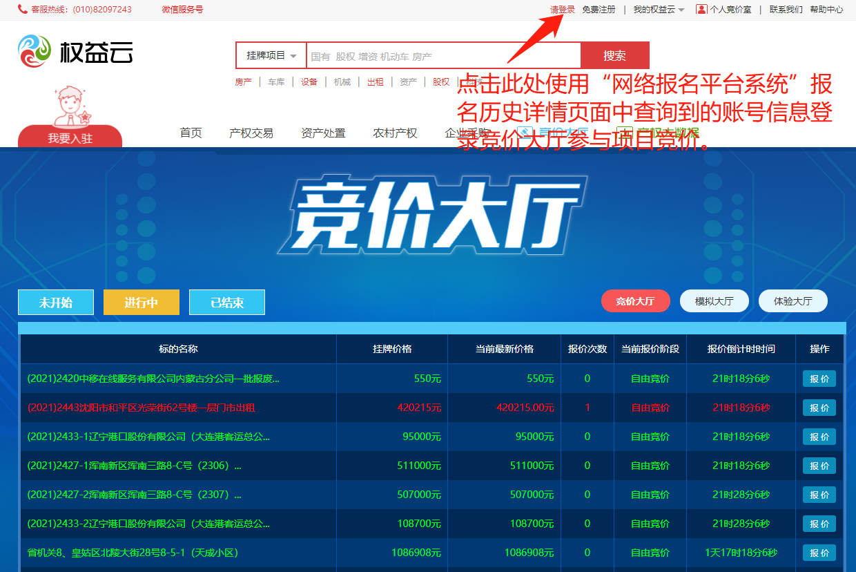 14.確認(rèn)您的交款到賬并審核通過后,您可以通過點擊競價大廳菜單進(jìn)入競價大廳,使用個人資料或報名詳情中的競價賬號,參與此項目的競價。競價賬號的初始化密碼會在首次實名認(rèn)證通過時通過短信的方式發(fā)送到您的手機(jī)。