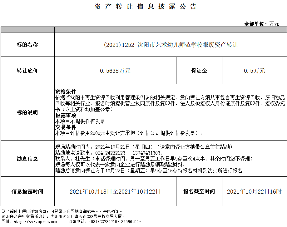 沈陽市藝術(shù)幼兒師范學校報廢資產(chǎn)轉(zhuǎn)讓
