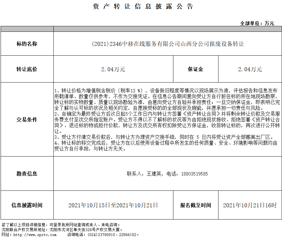 中移在線服務(wù)有限公司山西分公司1448臺(tái)(套)報(bào)廢設(shè)備轉(zhuǎn)讓