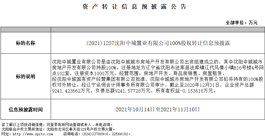 沈陽(yáng)中城置業(yè)有限公司100%股權(quán)轉(zhuǎn)讓預(yù)披露