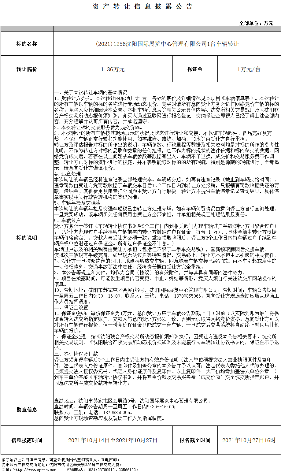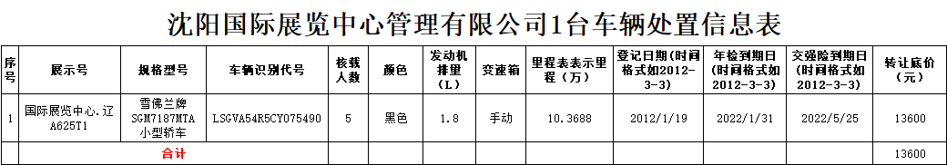 沈陽國際展覽中心管理有限公司1臺(tái)車輛轉(zhuǎn)讓