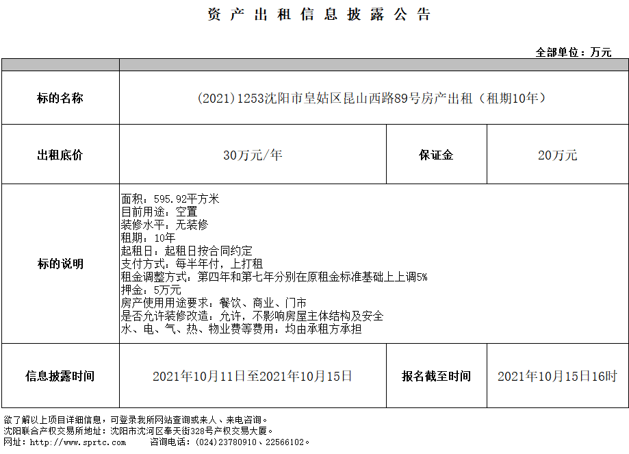 沈陽市皇姑區(qū)昆山西路89號房產(chǎn)出租(租期10年)