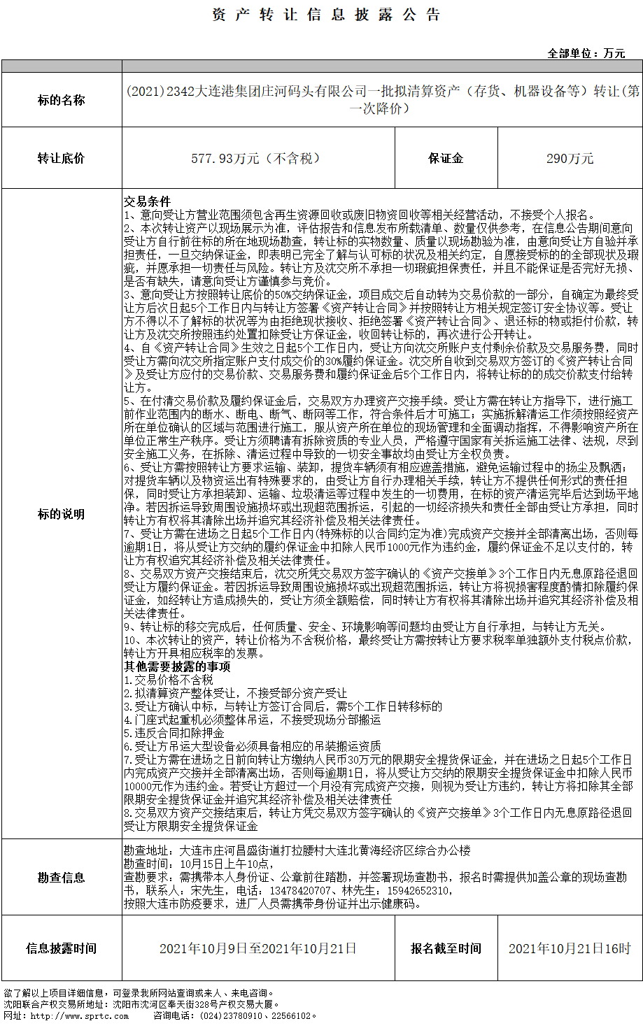 大連港集團(tuán)莊河碼頭有限公司一批擬清算資產(chǎn)(存貨、機(jī)器設(shè)備等)轉(zhuǎn)讓(第一次降價(jià))