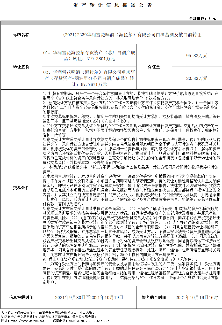 華潤雪花海拉爾存貨資產(chǎn)(總廠白酒產(chǎn)成品)轉(zhuǎn)讓
