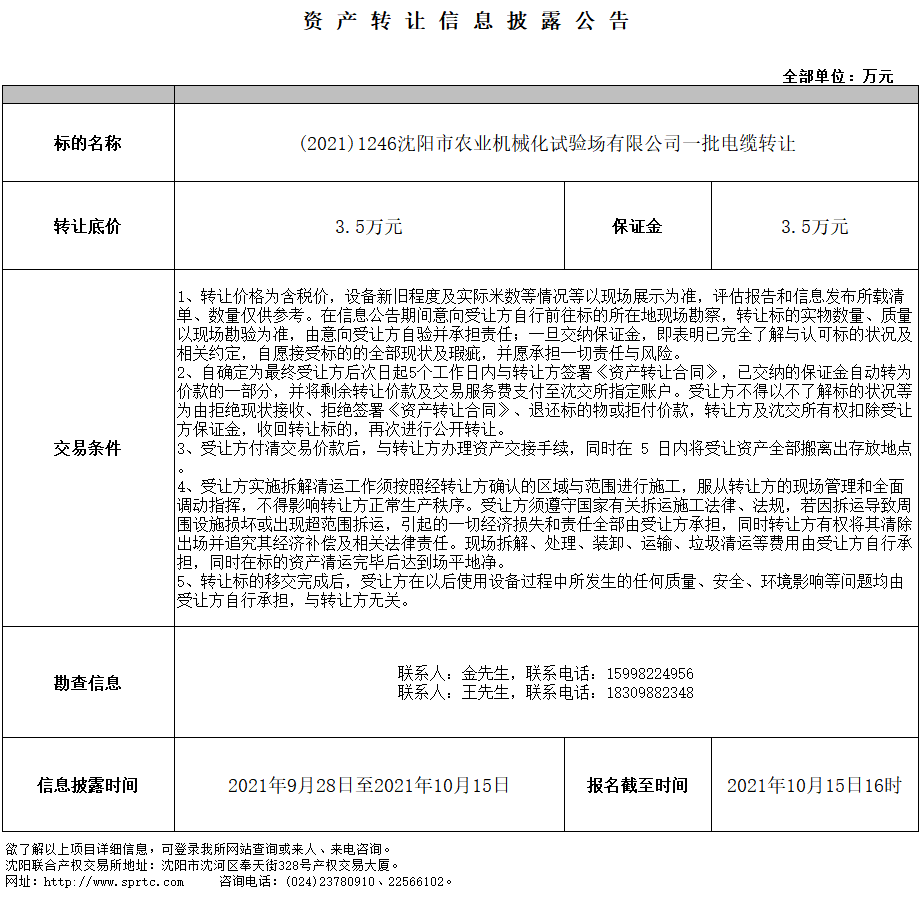 沈陽(yáng)市農(nóng)業(yè)機(jī)械化試驗(yàn)場(chǎng)有限公司一批電纜轉(zhuǎn)讓
