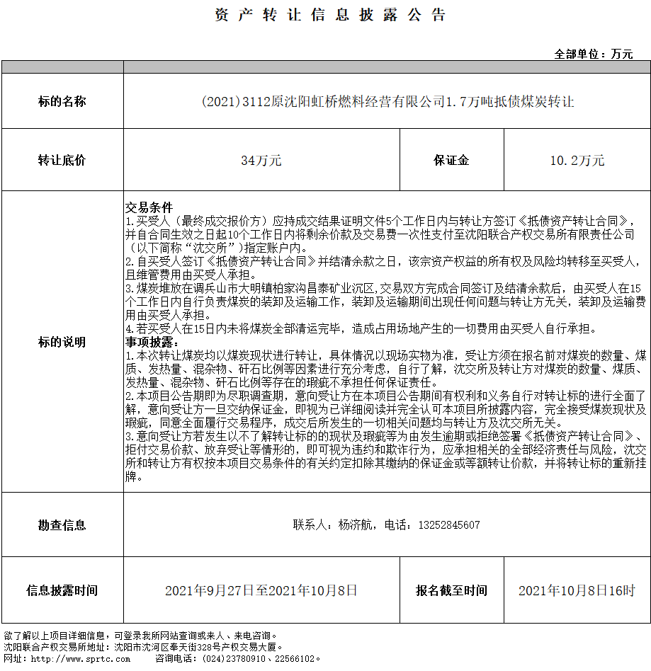 原沈陽(yáng)虹橋燃料經(jīng)營(yíng)有限公司1.7萬(wàn)噸抵債煤炭轉(zhuǎn)讓
