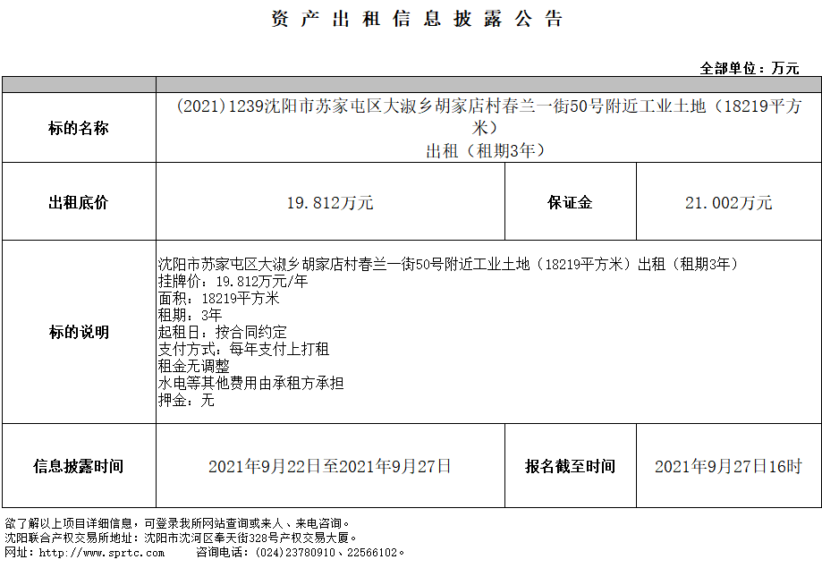 沈陽市蘇家屯區(qū)大淑鄉(xiāng)胡家店村春蘭一街50號附近工業(yè)土地(18219平方米)出租(租期3年)