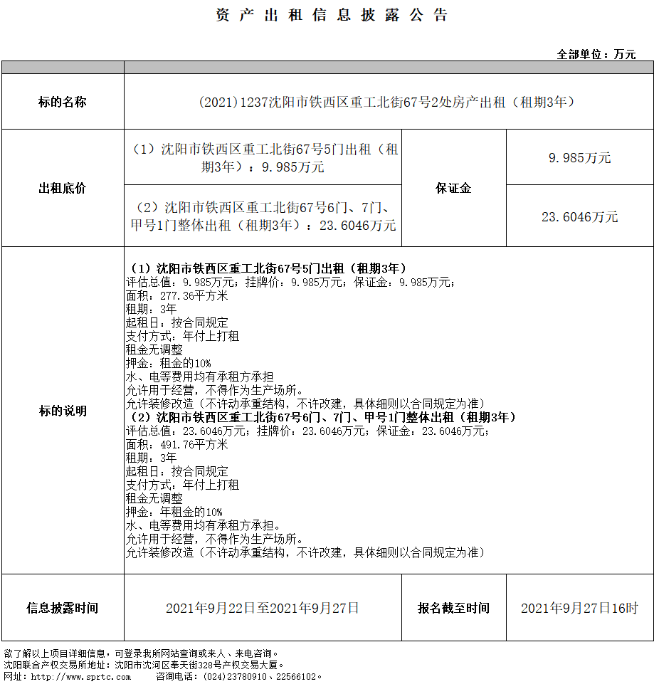 沈陽(yáng)市鐵西區(qū)重工北街67號(hào)6門(mén)、7門(mén)、甲號(hào)1門(mén)整體出租(租期3年)