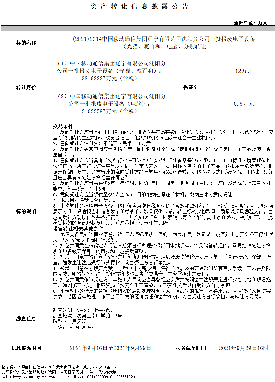 中國移動通信集團遼寧有限公司沈陽分公司一批報廢電子設備(光貓、魔百和)轉讓