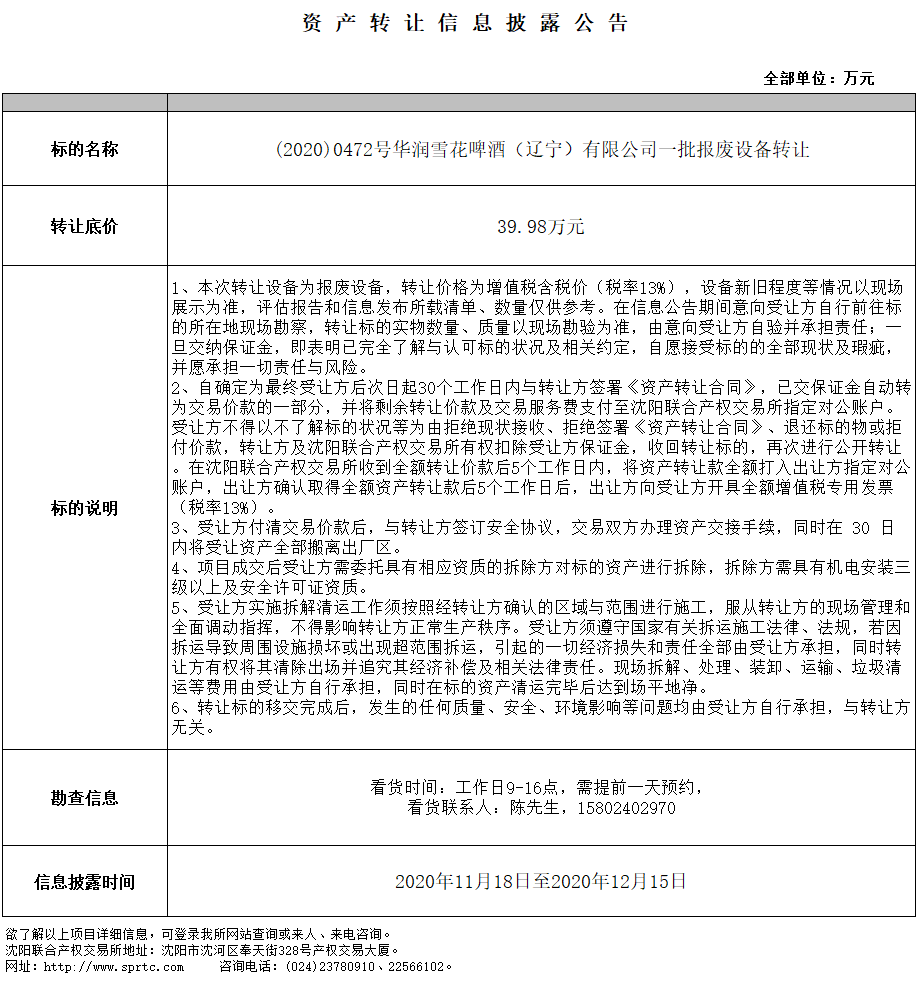 華潤雪花啤酒(遼寧)有限公司一批報廢設(shè)備轉(zhuǎn)讓