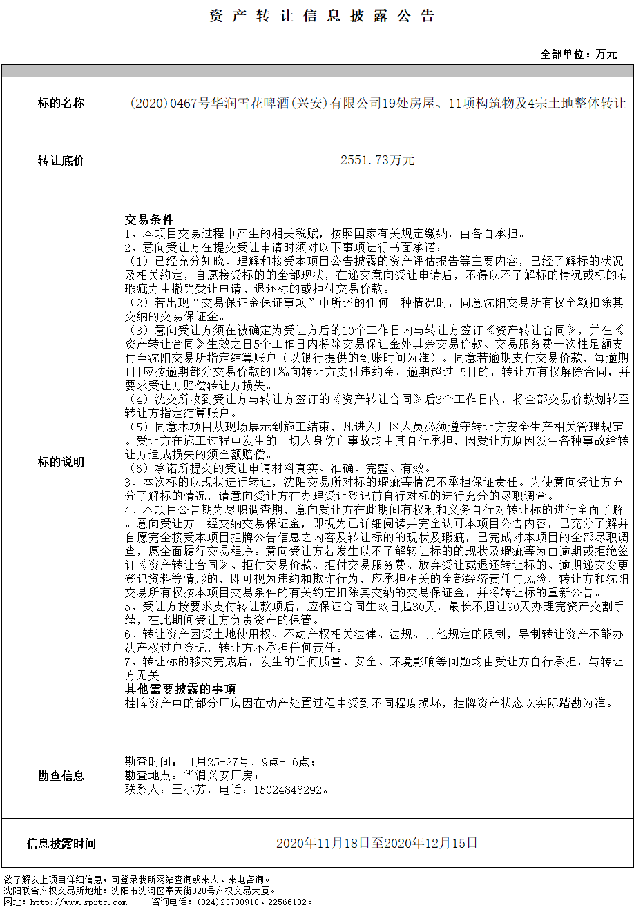 華潤雪花啤酒(興安)有限公司19處房屋、11項構筑物及4宗土地整體轉讓