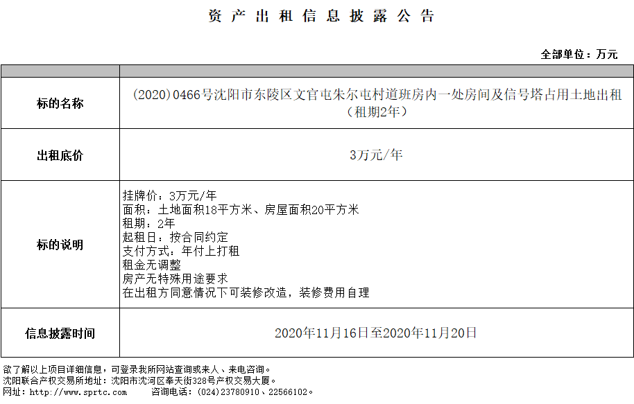 沈陽市東陵區(qū)文官屯朱爾屯村道班房?jī)?nèi)一處房間及信號(hào)塔占用土地出租(租期2年)