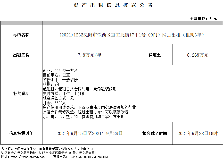 沈陽市鐵西區(qū)重工北街17甲1號(hào)(9門)網(wǎng)點(diǎn)出租(租期3年)