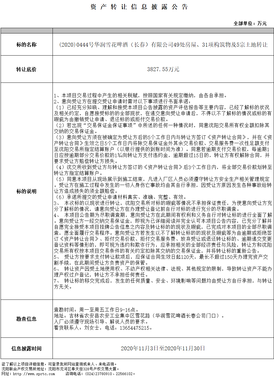 華潤雪花啤酒(長春)有限公司49處房屋、31項(xiàng)構(gòu)筑物及5宗土地 轉(zhuǎn)讓