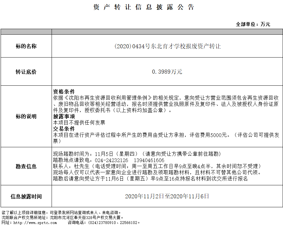 東北育才學(xué)校報(bào)廢資產(chǎn)轉(zhuǎn)讓