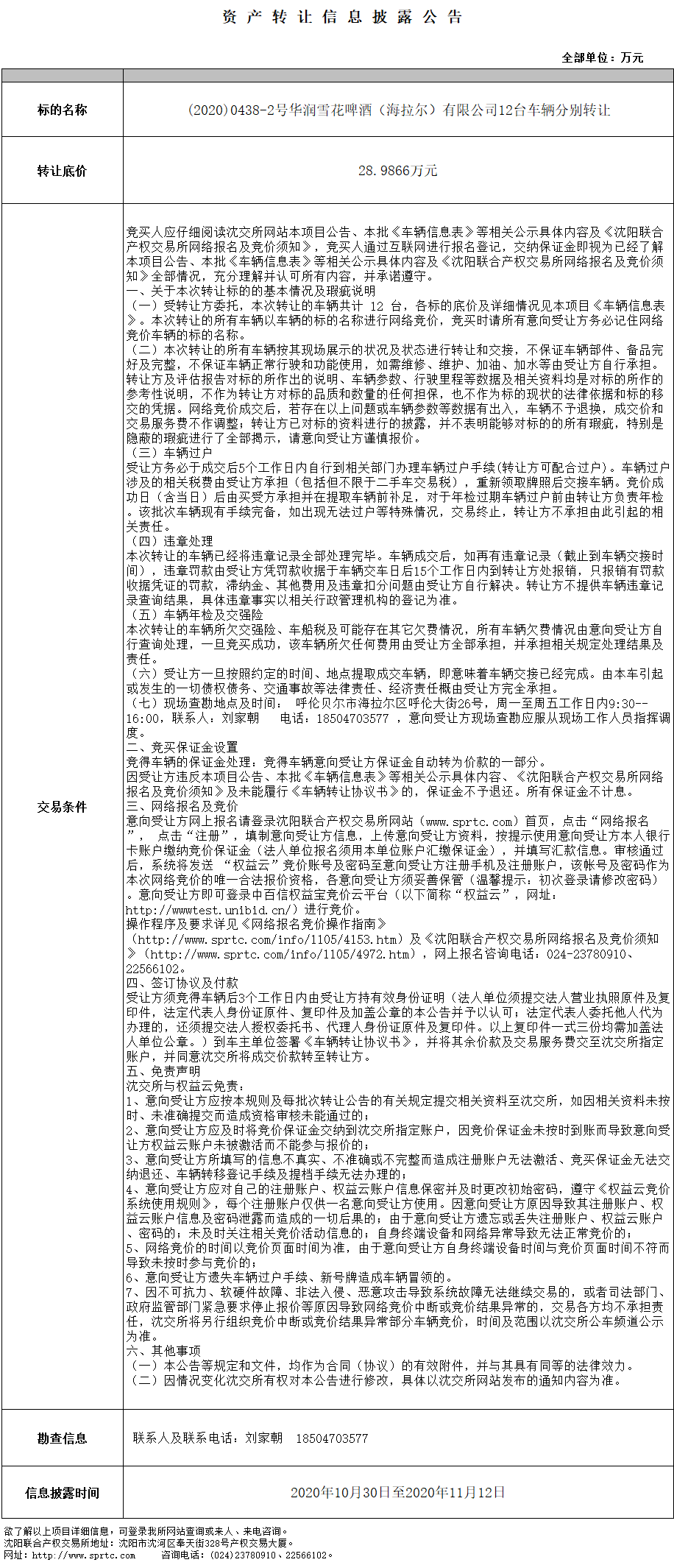 華潤(rùn)雪花啤酒(海拉爾)有限公司12臺(tái)車輛轉(zhuǎn)讓