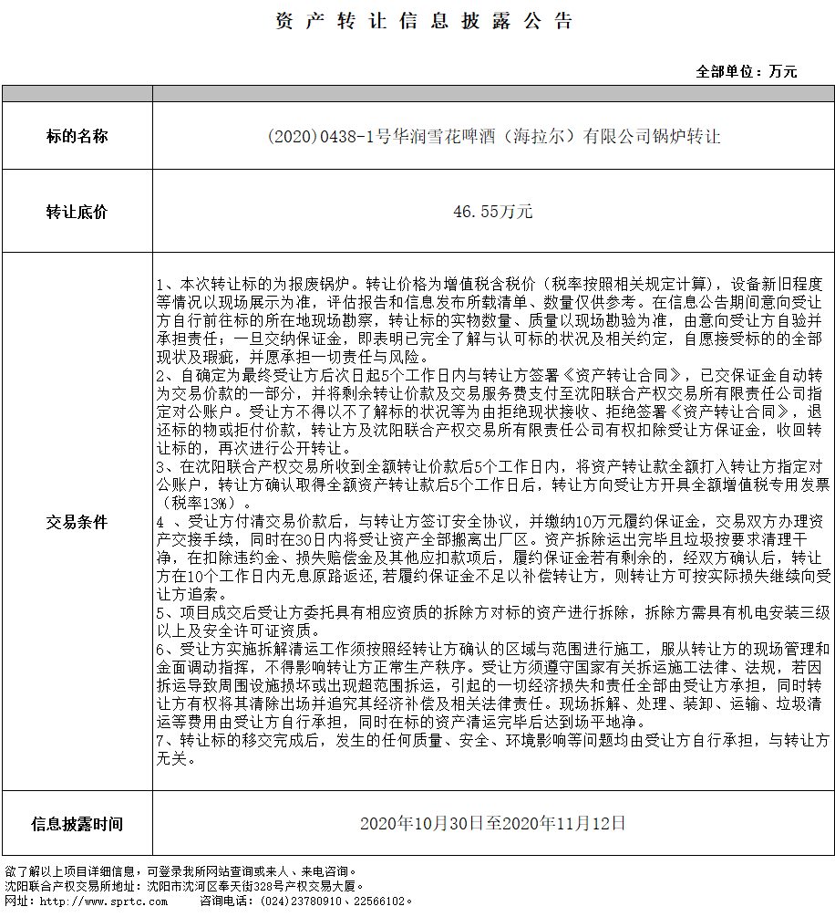 華潤雪花啤酒(海拉爾)有限公司燃煤鍋爐轉(zhuǎn)讓