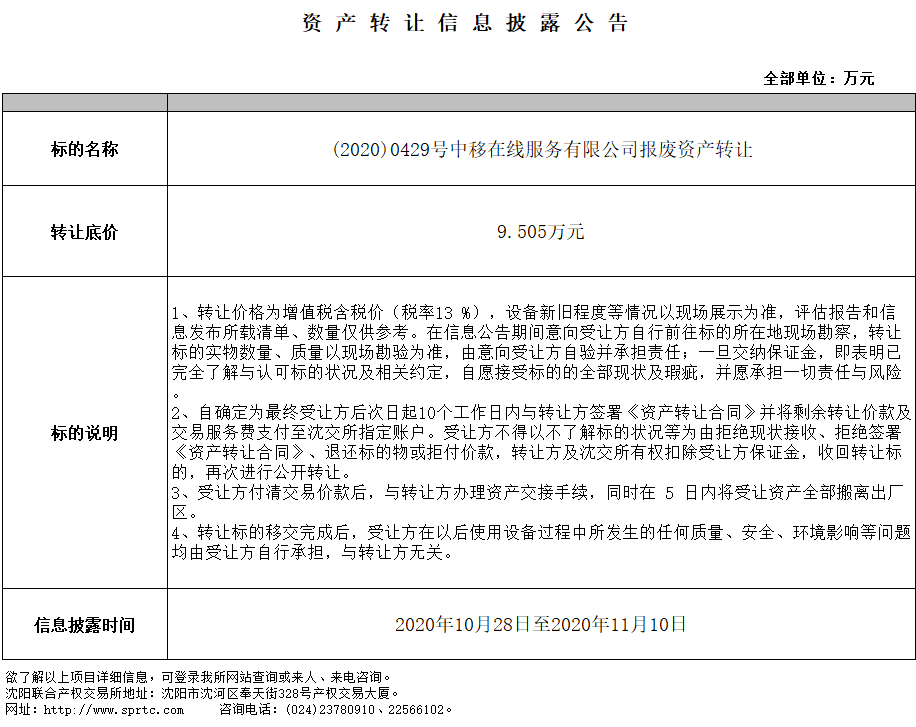 中移在線(xiàn)服務(wù)有限公司報(bào)廢資產(chǎn)轉(zhuǎn)讓