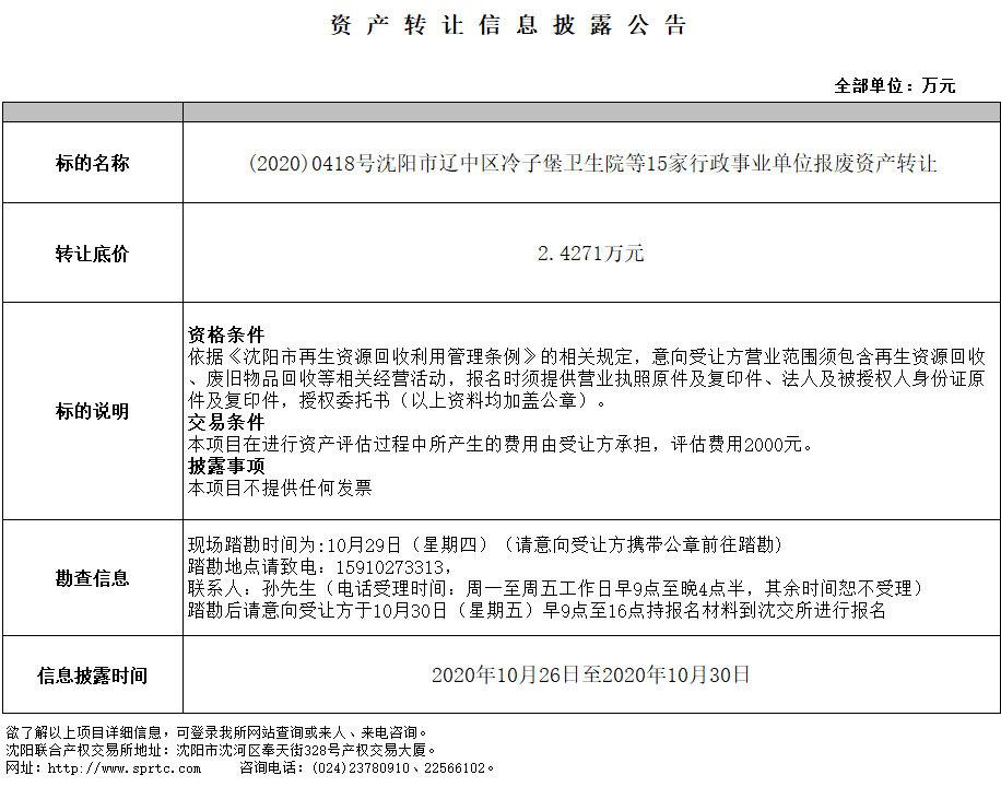 沈陽市遼中區(qū)冷子堡衛(wèi)生院等15家行政事業(yè)單位報(bào)廢資產(chǎn)轉(zhuǎn)讓