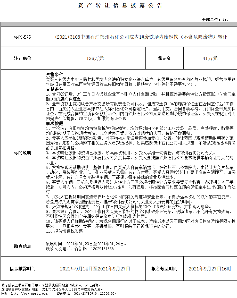 中國(guó)石油錦州石化公司院內(nèi)1號(hào)廢鐵場(chǎng)內(nèi)廢鋼鐵(不含危險(xiǎn)廢物)轉(zhuǎn)讓