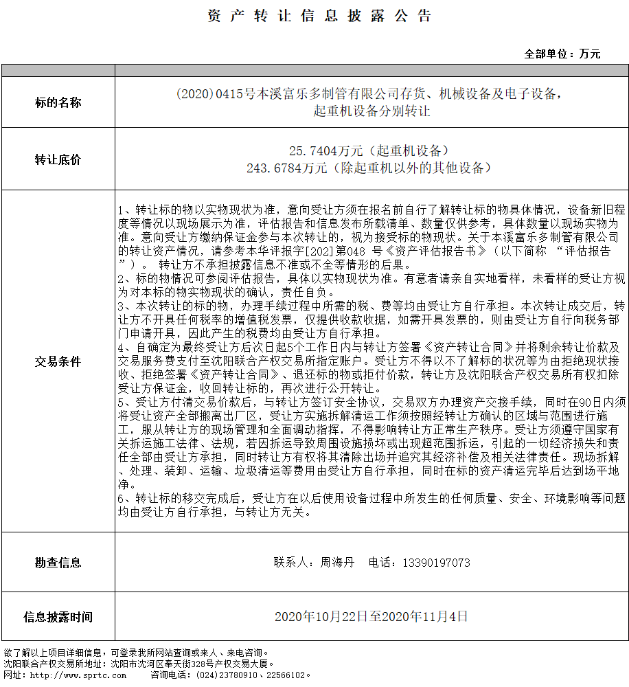 本溪富樂多制管有限公司存貨、機(jī)械設(shè)備及電子設(shè)備轉(zhuǎn)讓