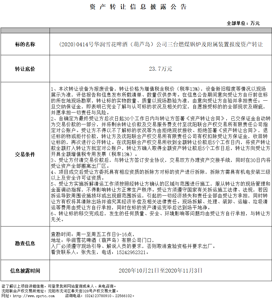 華潤(rùn)雪花啤酒(遼寧)有限公司葫蘆島分公司49項(xiàng)(三臺(tái)燃煤鍋爐及附屬裝置)報(bào)廢資產(chǎn)轉(zhuǎn)讓